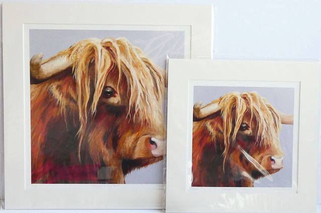 This Limited Edition Giclée Print shows a Highland Bull. From an original mixed media work where the bull's horn on the left protrudes towards the viewer in 3D.