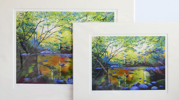 depicts a tranquil River shaded by the woodland nearby. Hues of greens and blues are prominent in this artwork.